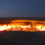 The Door to Hell, located in Derweze, Turkmenistan, is a giant hole of fire that was created when geologists accidentally tapped into a cavern teeming with natural gas. They burned off the hole, hoping that the fire would use all of the fuel that leaked and inevitably burn out, but it has continued burning to this day.