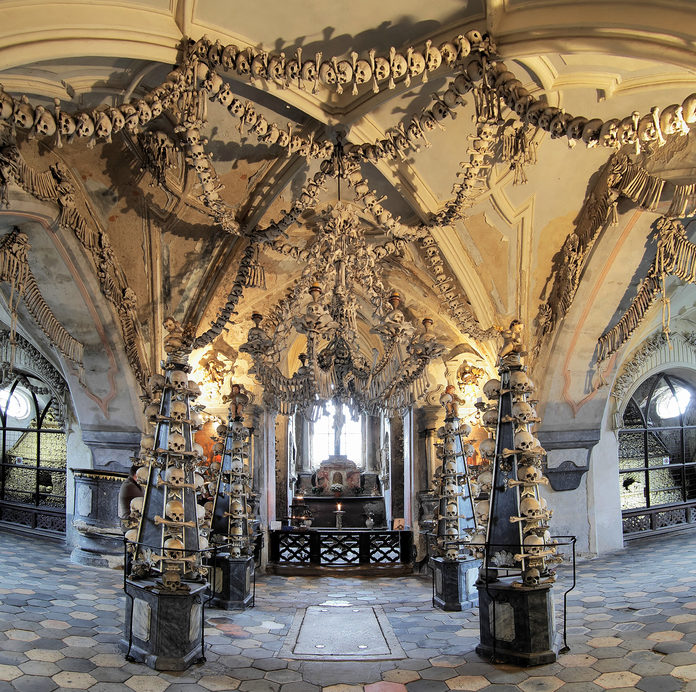 Interior of the Sedlec ossuary (Kostnice) decorated with skulls and bones, Kutna Hora, Czech Republic