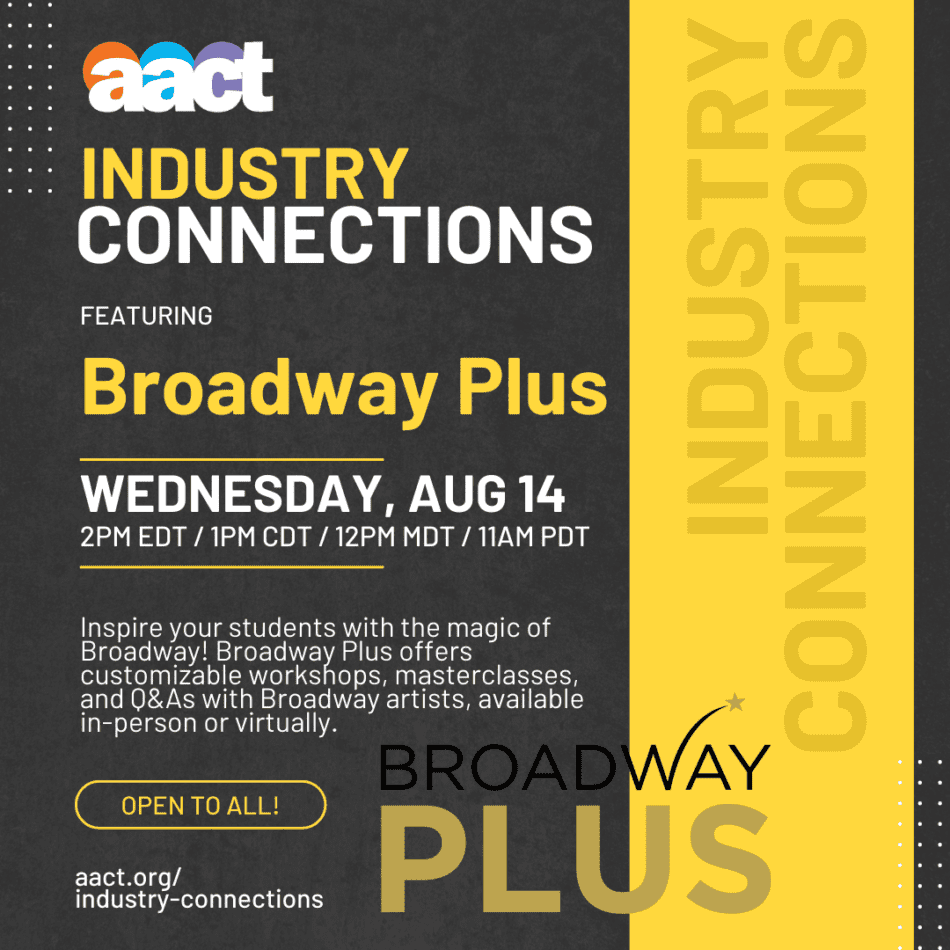 | JOIN US FOR AACT’S INDUSTRY CONNECTION WITH BROADWAY PLUS Inspire your students with the magic of Broadway! Broadway Plus offers customizable educational events, allowing students and audiences to learn and perform with Broadway artists through group workshops, audition masterclasses, and Q&As, available both in-person and virtually. These events are tailored to fit your group’s needs, age range, and budget, providing a unique opportunity to bring Broadway’s magic into your theater. |