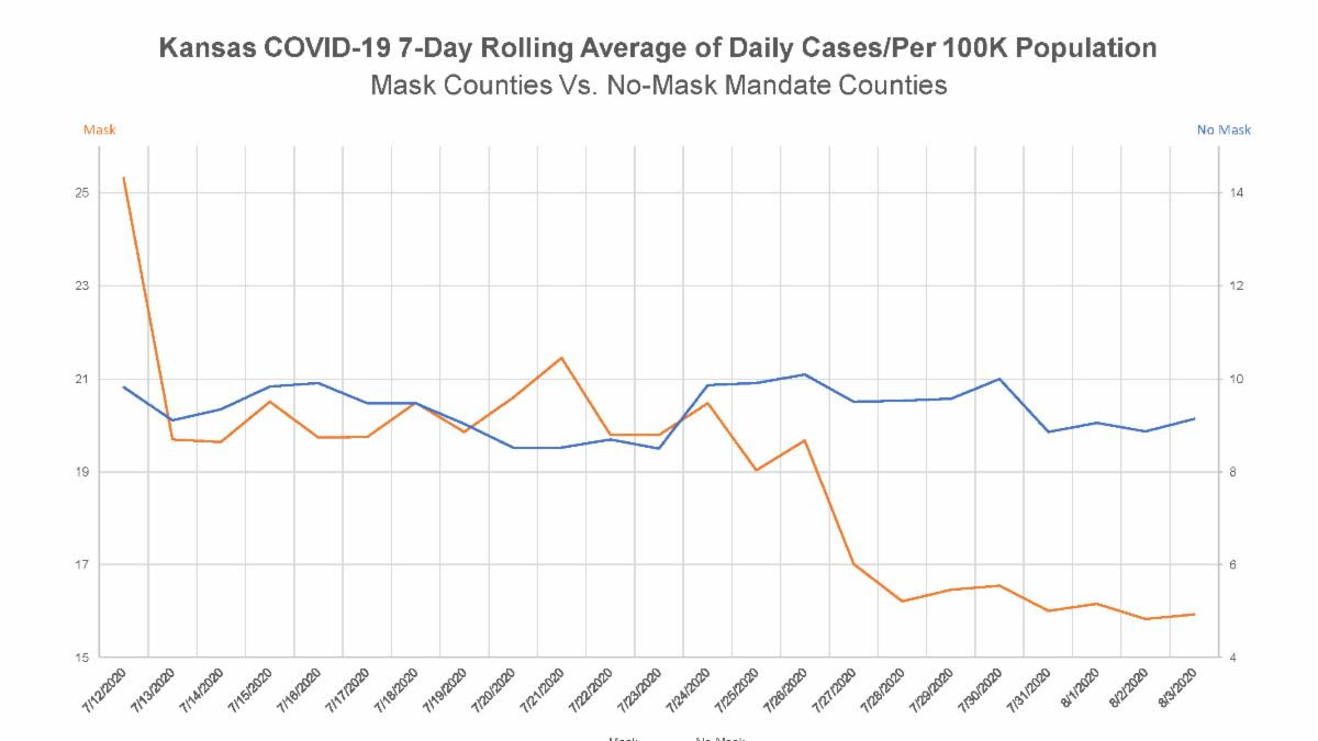 | Face coverings work so wear one As I conduct webinars and talk to people across our country, I am still amazed by folks who ask me pointed questions about whether face coverings actually work. They point to the fact that at first the CDC said they weren’t important and then changed direction when further facts were understood. They point to some made up constitutional right to infect others freely. They talk about other unproven ideas. Tonight, I hope to put this debate to rest thanks to the state of Kansas. Kansas conducted a perfect face covering experiment. Last month, Governor Kelly put a mandatory mask mandate in place. The Kansas legislature thought that they knew more about medicine and public health than the health department passed legislation that overrode the Governor’s mandate. As a result, some counties kept the mask mandate in place and others did not. In fact, 15 counties kept the mask mandate in place and 90 counties abandoned it. The interesting fact is that the 15 counties that kept the mandate are the more urban counties where there are more minority workers and a denser population. These counties have more ethnic minorities who in general are more likely to become infected. Whereas the 90 counties that abandoned the face coverings tended to be the more rural counties with less population density. So we had the perfect experiment. We had a control group that didn’t wear masks and an experimental group that did wear masks. Now some of you might be saying that this is not an accurate experiment because the groups weren’t matched well. The experimental group had a much higher chance of catching CoViD so there was bias in the experiment. So let’s see what happened. Here is a chart of the seven day rolling averages of daily cases per 100,000 population. |