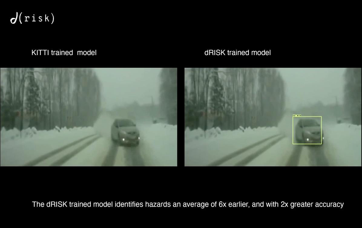 dRISK delivers simulated and real+simulated edge cases in semi-randomized, impossible-to-game training and test sequences, to achieve superior testing and retraining results for customers on real-life data. Unlike traditional training and development techniques, in which AVs are trained to recognize primarily whole entire vehicles and pedestrians under advantageous lighting conditions, with dRISK’s edge cases AVs are trained to recognize just the predictors of high-risk events (e.g. the headlights of an oncoming car peeking into the lane amid low-visibility). AV systems trained this way can recognize high-risk events sooner, without a significant decrease in performance on low-risk events.