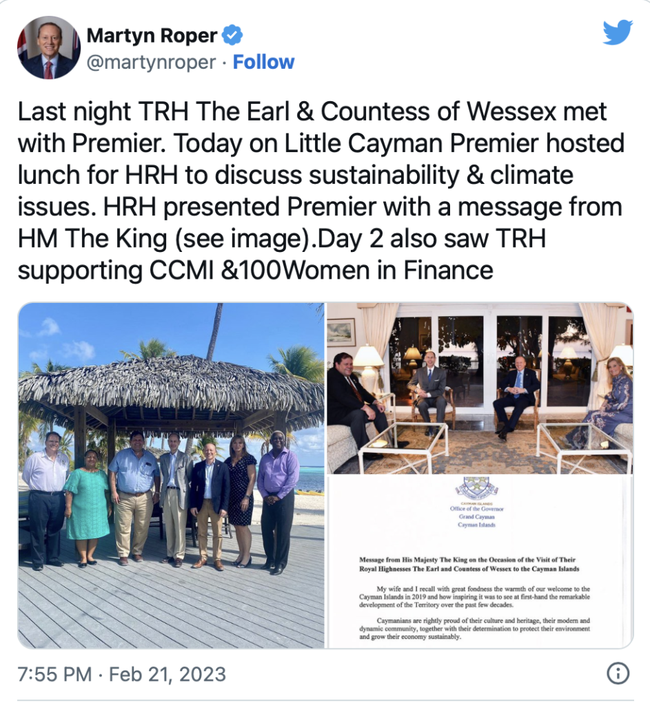 On arrival in the Cayman Islands, The Earl and Countess of Wessex were welcomed by the Governor, Mr Martyn Roper.