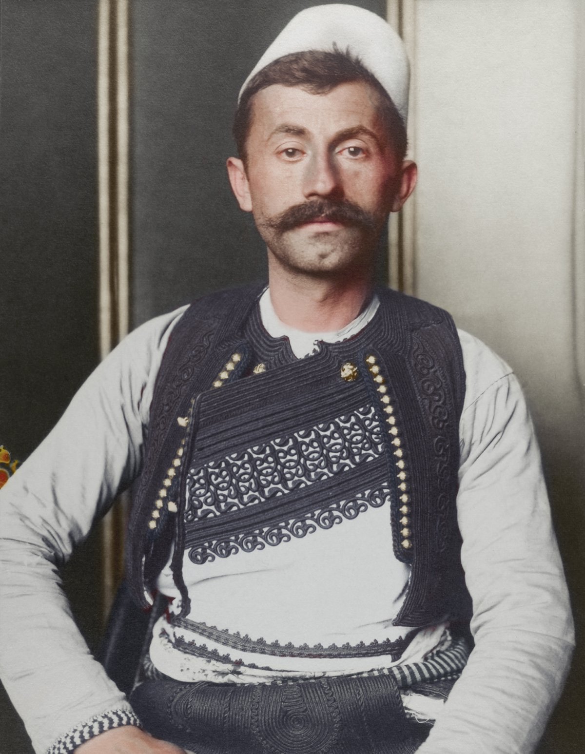 “The truncated brimless felt cap is known as a qeleshe, whose shape was largely determined by region and molded to one’s head. The vest, known as a jelek or xhamadan was decorated with embroidered braids of silk or cotton, its colour and decoration denoted the region where the wearer was from and their social rank.”