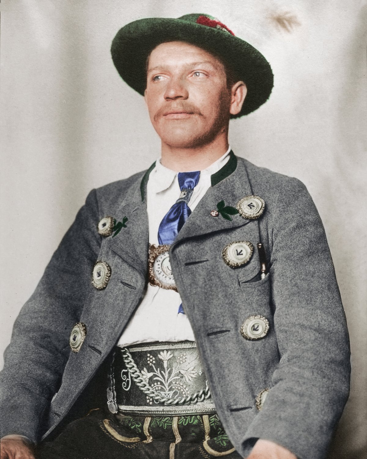 “The grey jacket, known as a trachtenjanker, is made from pulled wool and decorated with horn buttons, often used by hunters in the region.”