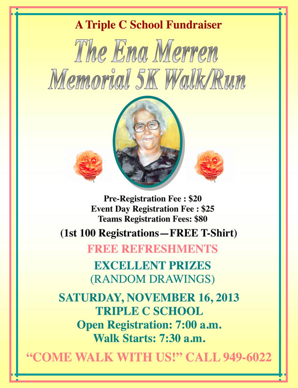 Ena Merren Memorial 5k Walk RunwebTriple C School will be having its first Ena Merren Memorial 5K Walk/Run and all are invited to come and participate. The event will be taking place: