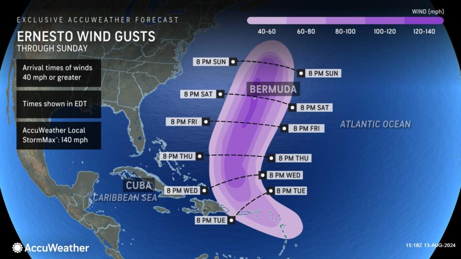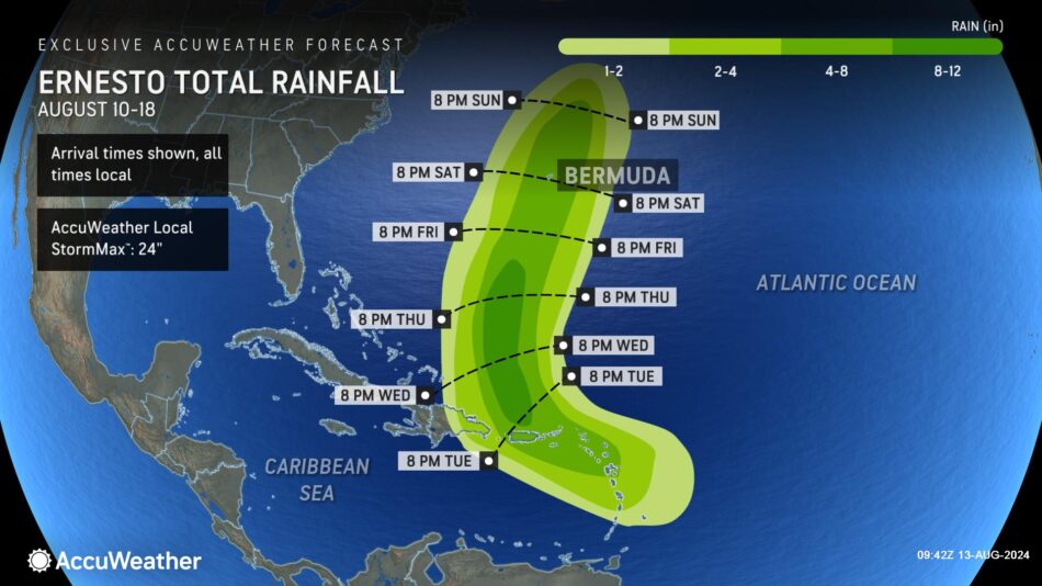 AccuWeather Global Weather Center – Aug. 13, 2024 – AccuWeather expert meteorologists say drenching rainfall from Ernesto could bring major impacts and extended power outages to Puerto Rico over the next 48 hours before turning northward and creating a risk of dangerous rip currents along Atlantic beaches along the U.S. East coast.