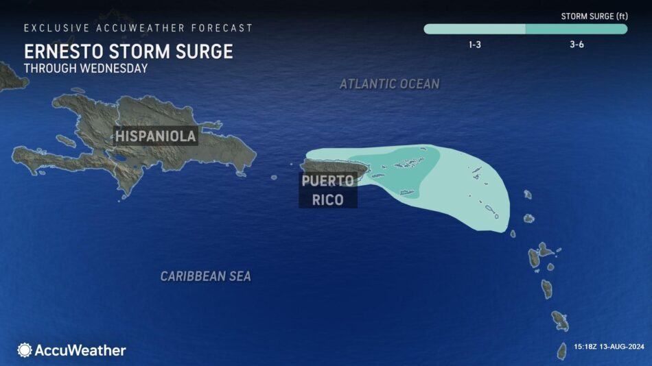 A storm surge of up to 3-6 feet is forecast for portions of the Leeward Islands to Puerto Rico, which would lead to flooding and coastal erosion into Wednesday. The greatest storm surge impacts are expected in the Virgin Islands and Puerto Rico as Ernesto gains strength.