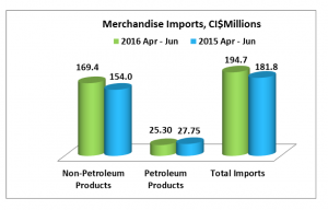 When compared to the same period in 2015, the second quarter imports represent a 7.1% increase. Similar to the first quarter of 2016, the rise in importation was primarily due to non-petroleum products which amounted to CI$169.4 million. Among these goods are capital goods such as electrical machinery and apparatus, power generating machinery and other specialized machinery. Transport and equipment parts and accessories also recorded a strong growth of 17.7%.