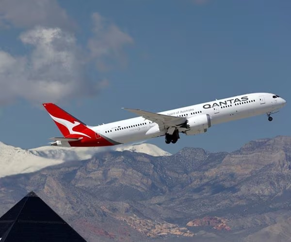Boeing 787 Dreamliner belonging to Australian airline QUANTAS, passes the Luxor Las Vegas casino hotel on the Las Vegas Strip as it takes off from Harry Reid International Airport in Las Vegas, Nevada. (Larry MacDougal/AP