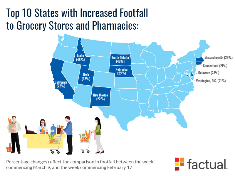 The Covid-19 coronavirus outbreak has caused unprecedented disruption and uncertainty throughout the globe. As the virus spreads, movement and interaction worldwide has already begun to change. To help understand the impact of what’s happened thus far, Factual examined visitation to physical locations in various business categories over the past four weeks, from Feb. 17 through March 15 (using the week of Feb. 17 as a baseline), to help quantify shifts in movement and provide some insight into what’s happening. Unless otherwise noted, percentage changes reflect the comparison in footfall between the week commencing March 9, and the week commencing February 17. Grocery, Pharmacy, and Retail Nationwide, grocery stores and pharmacies have seen the most dramatic increases in footfall beginning the week of March 9 (12% and 17% respectively). Following the World Health Organization’s declaration of a pandemic on March 11, both grocery stores and pharmacies experienced a 50% increase in footfall compared to the day before the announcement.