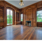 The wood-paneled library features floor-to-ceiling windows with huge glass panes.