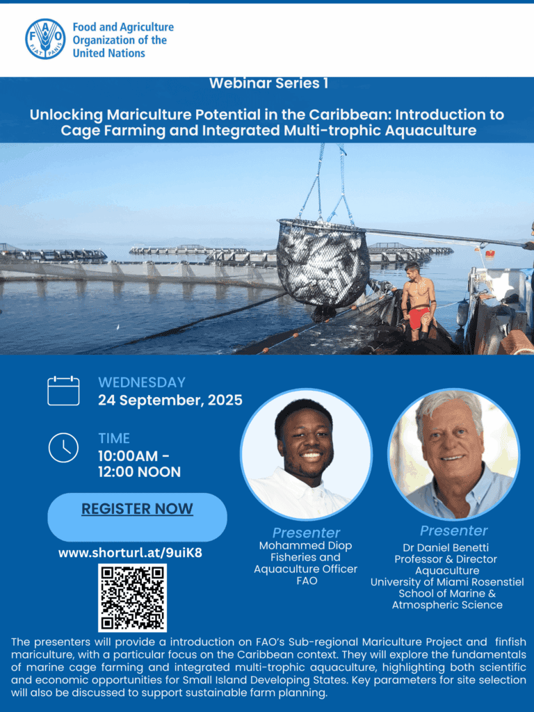 It is with great pleasure that we invite you to participate in the FAO Caribbean Mariculture Webinar Series, organized under the CARICOM Sub-Regional Mariculture Project. This initiative is designed to strengthen national and regional capacity in marine aquaculture, with a focus on practical knowledge transfer that supports food security, economic growth, and sustainable coastal development.