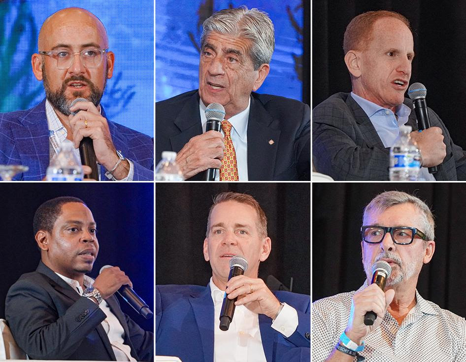 Presidential Panel participants (top row l-r) Christopher Ivy, CEO, Margaritaville at Sea; Rick Sasso, Chairman, MSC Cruises USA; and Harry Sommer, President & CEO, Norwegian Cruise Line Holdings Ltd.; (Bottom row l-r) Alexander Gumbs, CEO, Port St. Maarten Group; John Padgett, President, Princess Cruises; and Michael Bayley, President & CEO, Royal Caribbean International