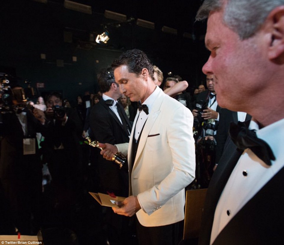 Rough night: Cullinan (above in 2015 with Matthew McConaughey) is stationed at one of the entrances to the stage to hand out the envelope announcing the winner in each category