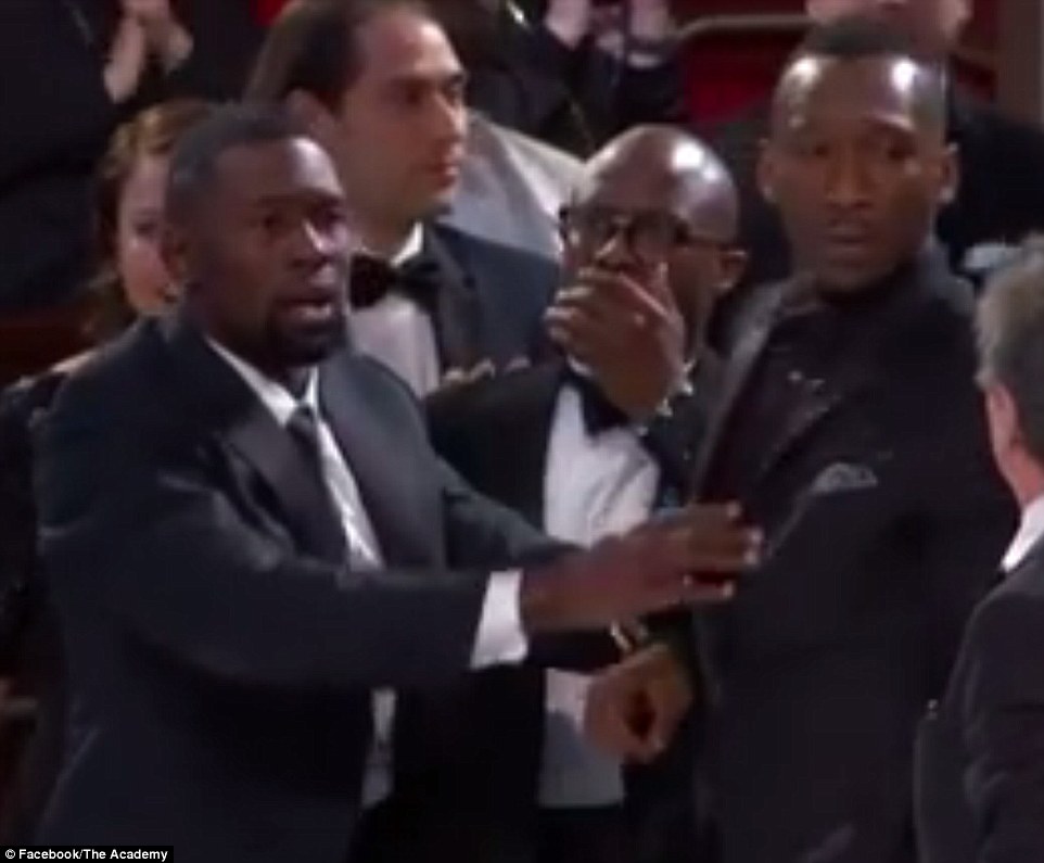 Emotional moment: Mahershala Ali and Naomi Harris couldn’t mask their bewilderment as they made their way to the stage