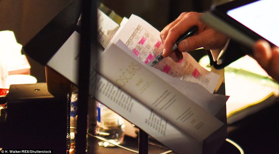 Too many choices: In Cullinan’s hand are a jumble of envelopes and his phone, just seconds before he hands the wrong one off to Beatty