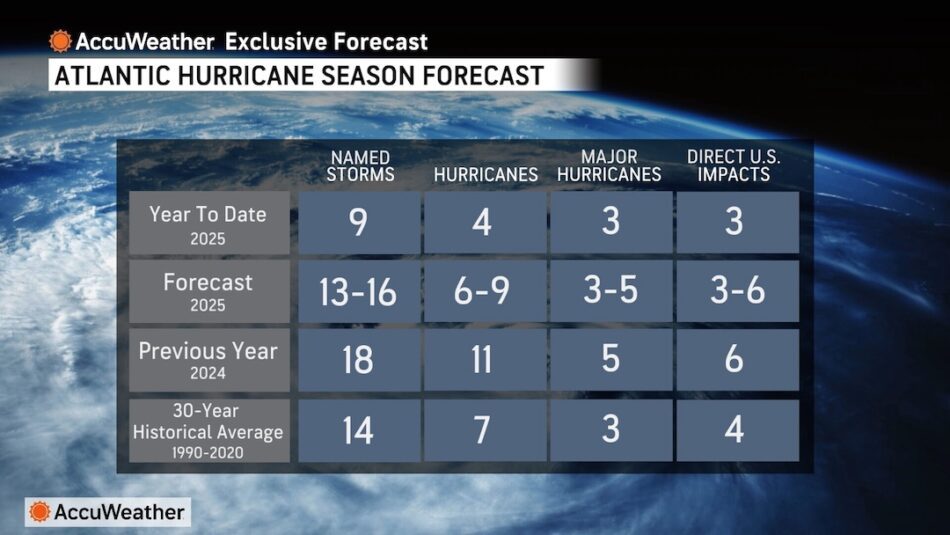 “There have been nine named storms to date. AccuWeather continues to forecast 13 to 16 named storms for the 2025 Atlantic hurricane season. The lower end of the range is most likely at this time,” DaSilva said. “AccuWeather cannot rule out the possibility of 15 or 16 named storms this season due to sea surface temperatures and ocean heat content that is above the historical average in the Atlantic basin. Disruptive wind shear is also expected to lessen. AccuWeather hurricane experts are constantly refining and integrating new data into our predictions and lowered the seasonal forecast recently, compared to other known sources.”