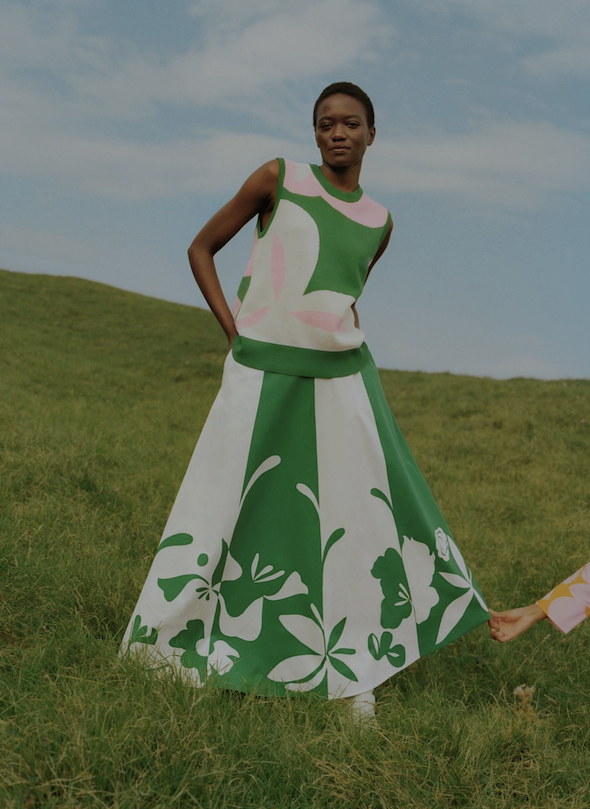The exhibition’s Fashion section also showcases works by The Arc, Stephanie Comilang, Camomile Creations, and Holly Stephenson. All set against the backdrop of rich wall colours, decorative patterns, and Sanderson Design Group wallpaper – further nodding to the proliferation of floral design in fashionable interiors. It offers a rich exploration of nature’s boundless inspiration in fashion and beyond.