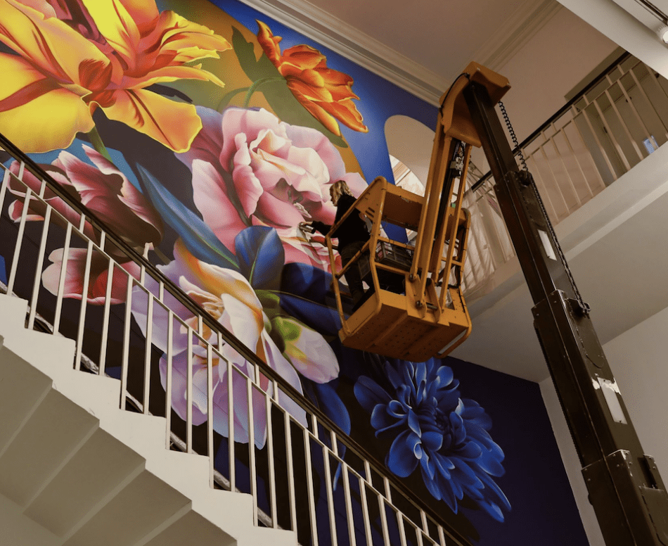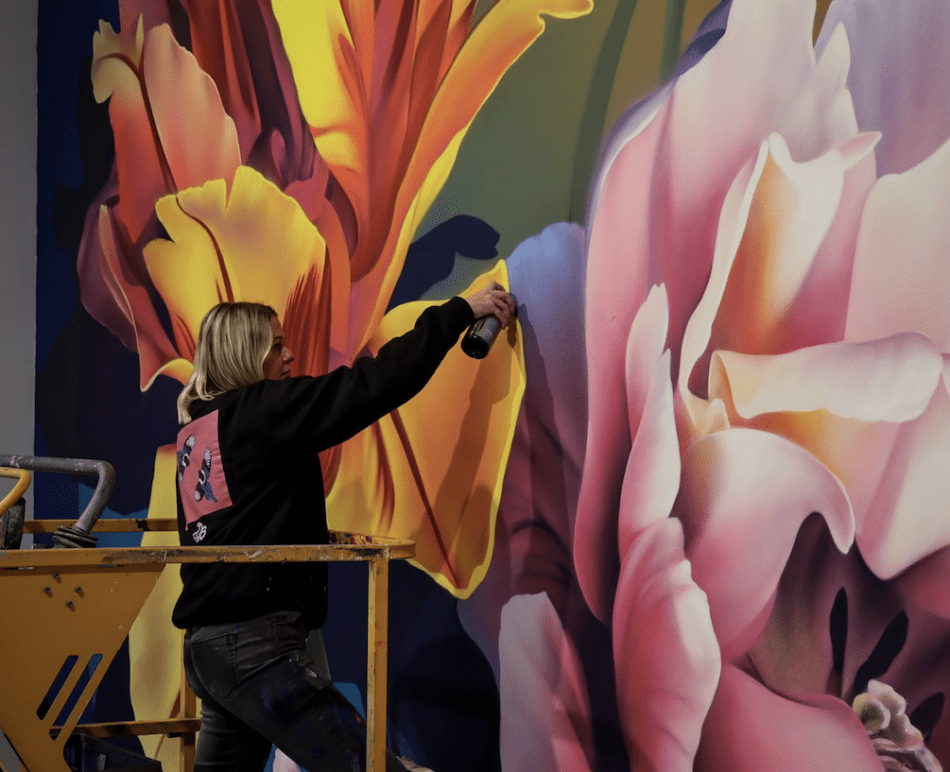 The mural is titled Journey of Progress and offers a personal reflection of Mess’ journey as an artist: “It suggests growth is built over time, piece by piece, and that every experience is part of a larger journey of development, or all part of ‘the bigger picture’. The soft blue flowers at the darker bottom of the piece represent early, quiet stages of growth, while the bold, fiery oranges and yellows of the flamboyant tulips at the top symbolize breakthroughs and powerful moments of progress.”