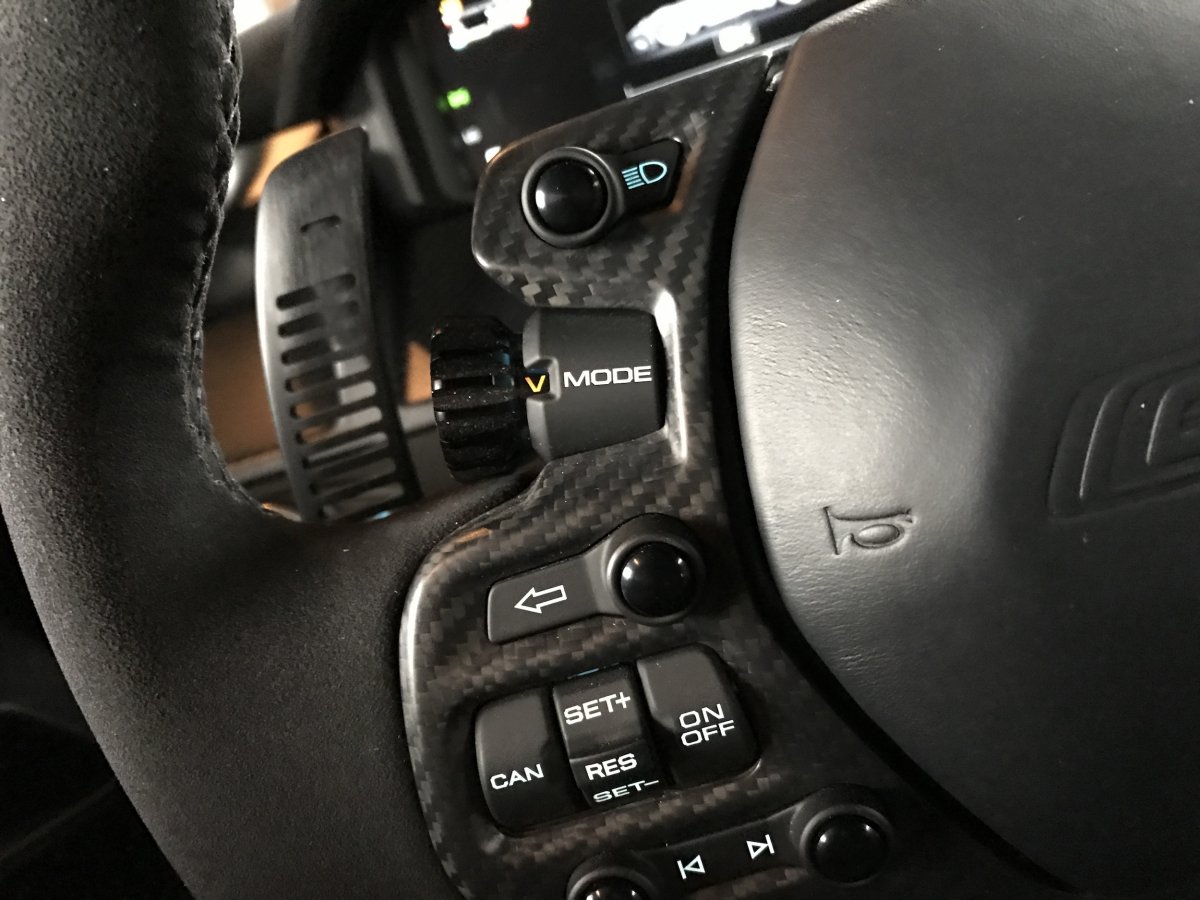 Speaking of driving modes, here’s where they’re controlled. It’s a thumb-wheel version of Ferrari’s famous Manettino dial — call it a thumbettino!