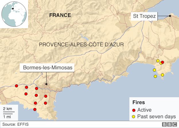 One of the worst fires is raging in an area near the popular resort of Saint-Tropez.
