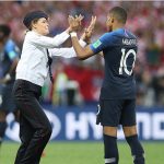 A pitch invader, from Russian punk protest group Pussy Riot, high fives France’s Kylian Mbappé, before being dragged away