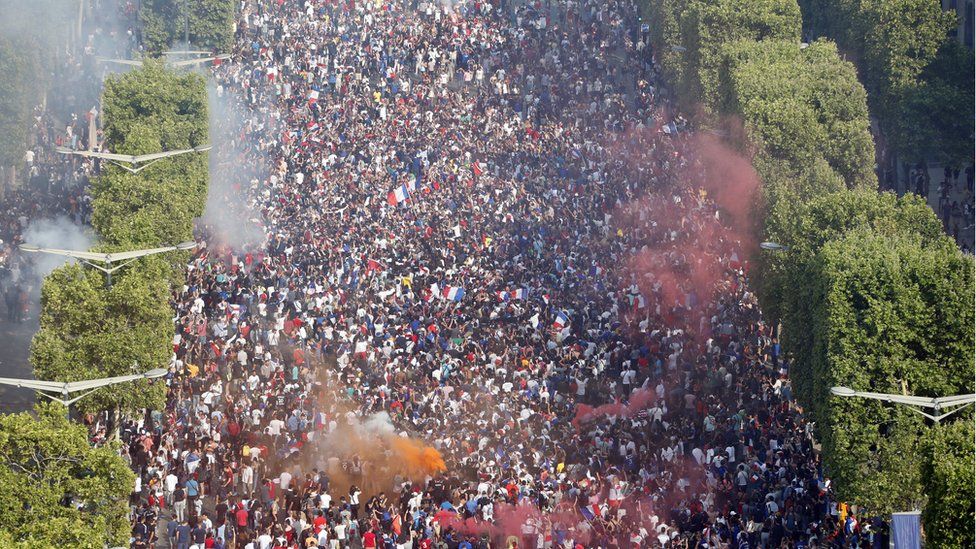 French supporters celebrate on the Champs-Élysées avenue in France, 15 July 2018Image copyright EPA