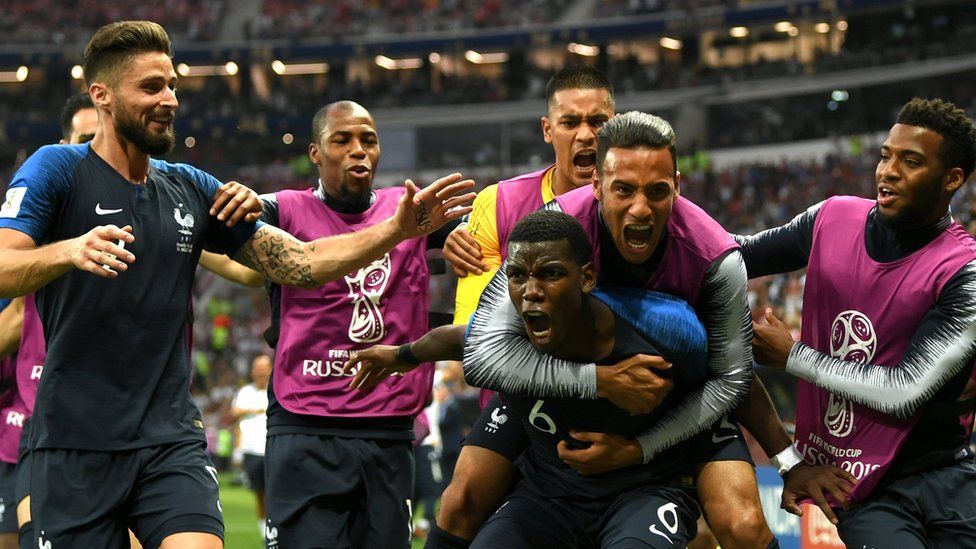 France’s Paul Pogba celebrates with teammates after scoring the third of France’s four goalsImage copyright GETTY IMAGES