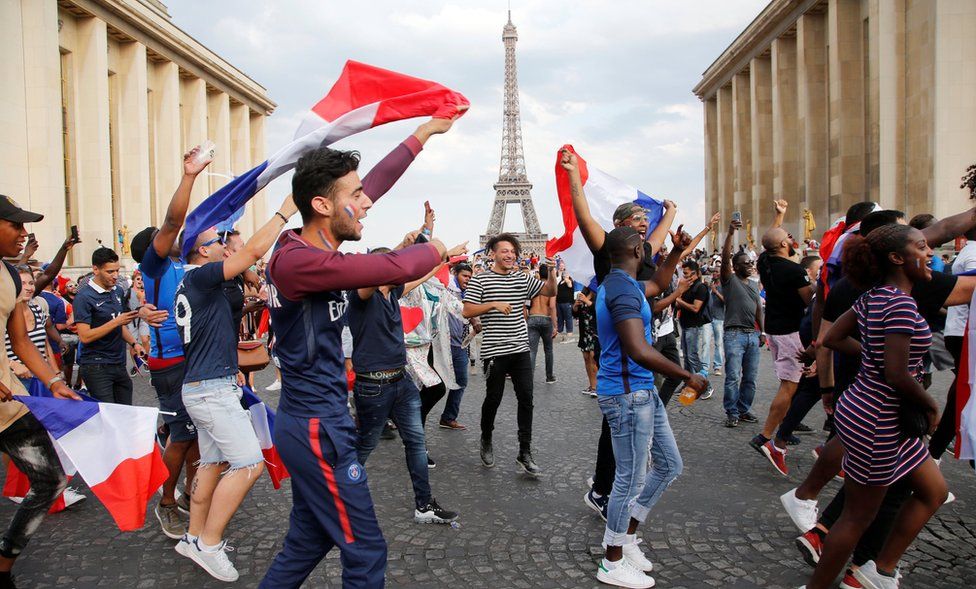 French fans in Paris celebrate in front of the Eiffel Tower, 15 July 2018Image copyright REUTERS