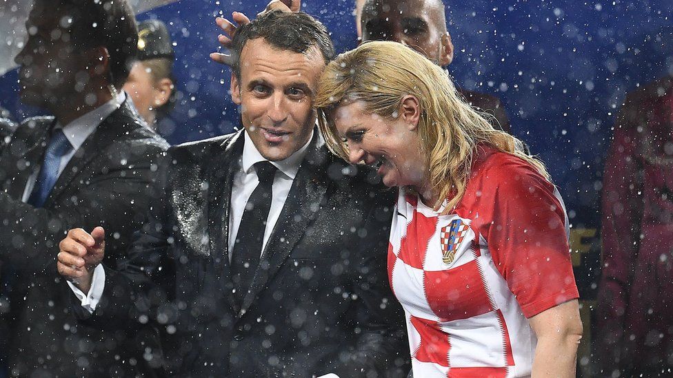 French President Emmanuel Macron (left) talks with Croatian President Kolinda Grabar-Kitarovic during the trophy ceremony at the end of the Russia 2018 World Cup final football match between France and CroatiaImage copyright AFP/GETTY
