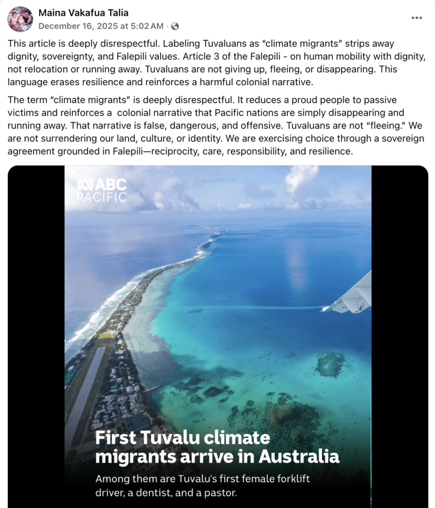 This week: Tuvaluan Minister for Home Affairs, Climate Change & Environment Maina Vakafua Talia on why the term “climate migrants” erases sovereignty and reinforces colonial narratives.