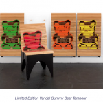 The Vandal Gummy Bear Tambour: We share the canvas of New York with some of the most vibrant artists in the world. This Limited Edition tambour is a collaboration with WhIsBe, one of our favorite street artists known worldwide for his bold imagery and subversive pop culture messaging. Provocative and fun, the Vandal Gummy Bear aligns perfectly with our own refined yet renegade design principles. The artwork is silk screened onto hand-finished maple wood slats. Hang these functional art pieces on the wall Warhol-style when not in use…and relish in the secret optical illusion that occurs when the chairs are deployed!