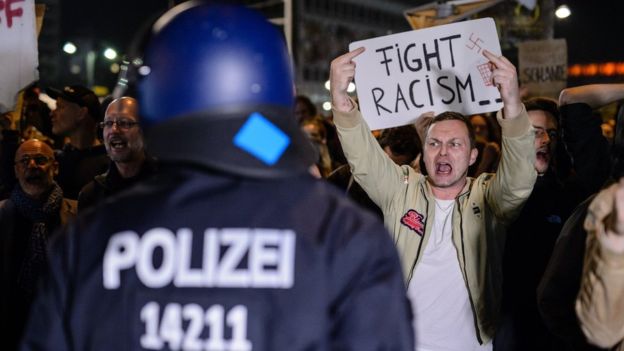 Opponents of the Alternative for Germany (AfD) protest against the result of the German electionImage copyright GETTY IMAGES