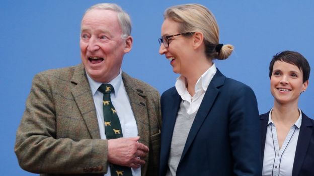 Frauke Petry (R), chairwoman of the anti-immigration party Alternative fuer Deutschland (AfD) poses next top candidates Alice Weidel and Alexander Gauland (L) before a news conference in Berlin, Germany, September 25, 2017Image copyrightREUTERS