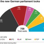 With the SPD out of play, the most likely scenario is a “Jamaica” coalition, so-called because of the colours of Jamaica’s flag. It includes the black CDU/CSU, the yellow, business-friendly Free Democrats (FDP) – who are returning to parliament after a four-year hiatus with 80 seats – and the Greens (67 seats).