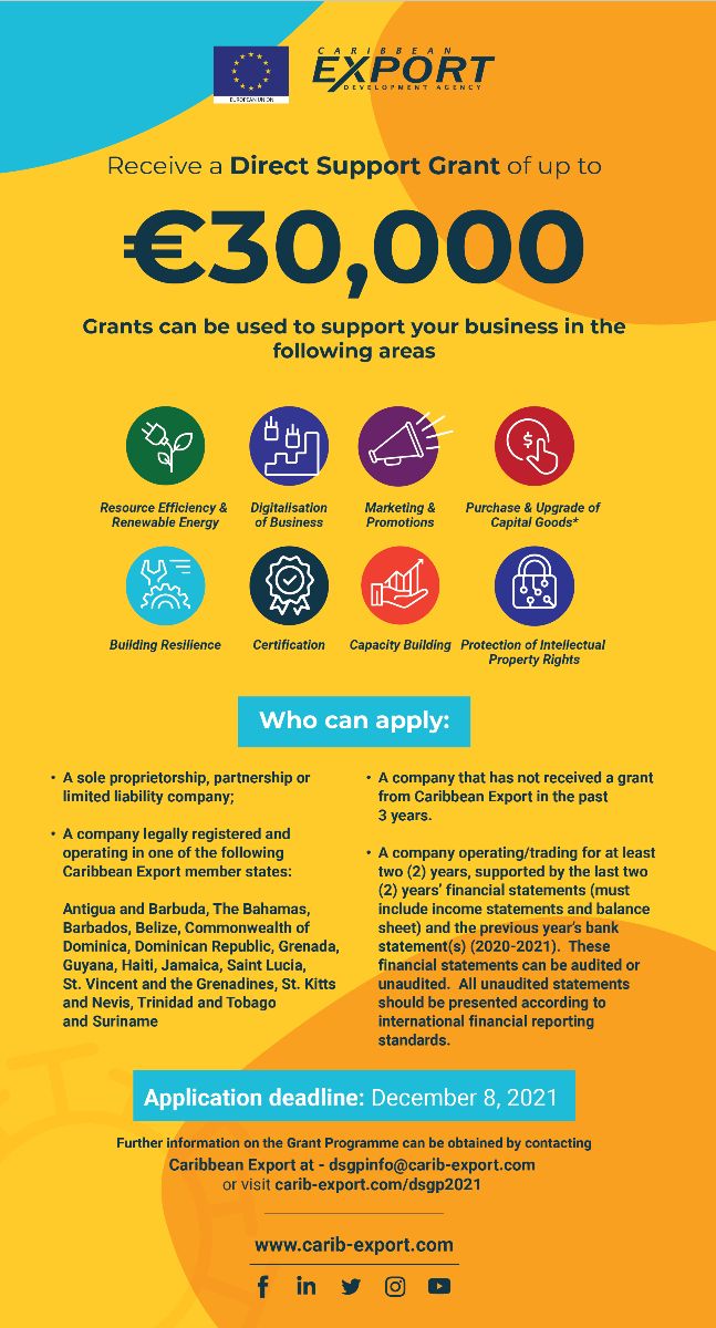 The Direct Support Grants Programme (DSGP) was developed in response to the immediate need for firms to retool and mitigate the impact of the coronavirus (COVID-19) pandemic. Caribbean Export has allocated funds for CARIFORUM firms, to be dispersed as grant funding in 2022. This funding is provided by the European Union under the 11th EDF Regional Private Sector Development Programme.