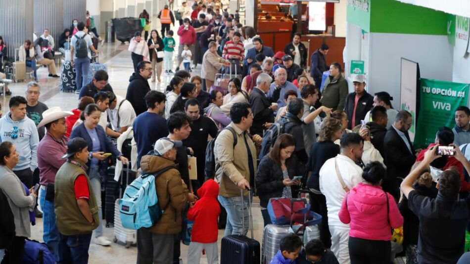 IMAGE SOURCE, EPAImage caption, Travellers line up at the Mexico City International Airport after hundreds of flights faced disruption there