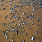 An aerial view of the Chong Kneas floating village on Tonle Sap Lake, Cambodia. The lake’s seasonal cycles are threatened by changing rainfall patterns and rising temperatures.