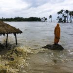A woman stands on the Indian island of Mousuni, in the Bay of Bengal, where a rise in sea level threatens to permanently force families from their homes.