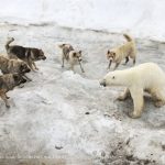 Guard dogs confront a polar bear on the Franz Josef Land archipelago. As Arctic sea ice disappears, bears are increasingly moving into human settlements in search of food.