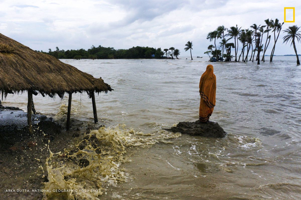 A woman stands on the Indian island of Mousuni, in the Bay of Bengal, where a rise in sea level threatens to permanently force families from their homes.