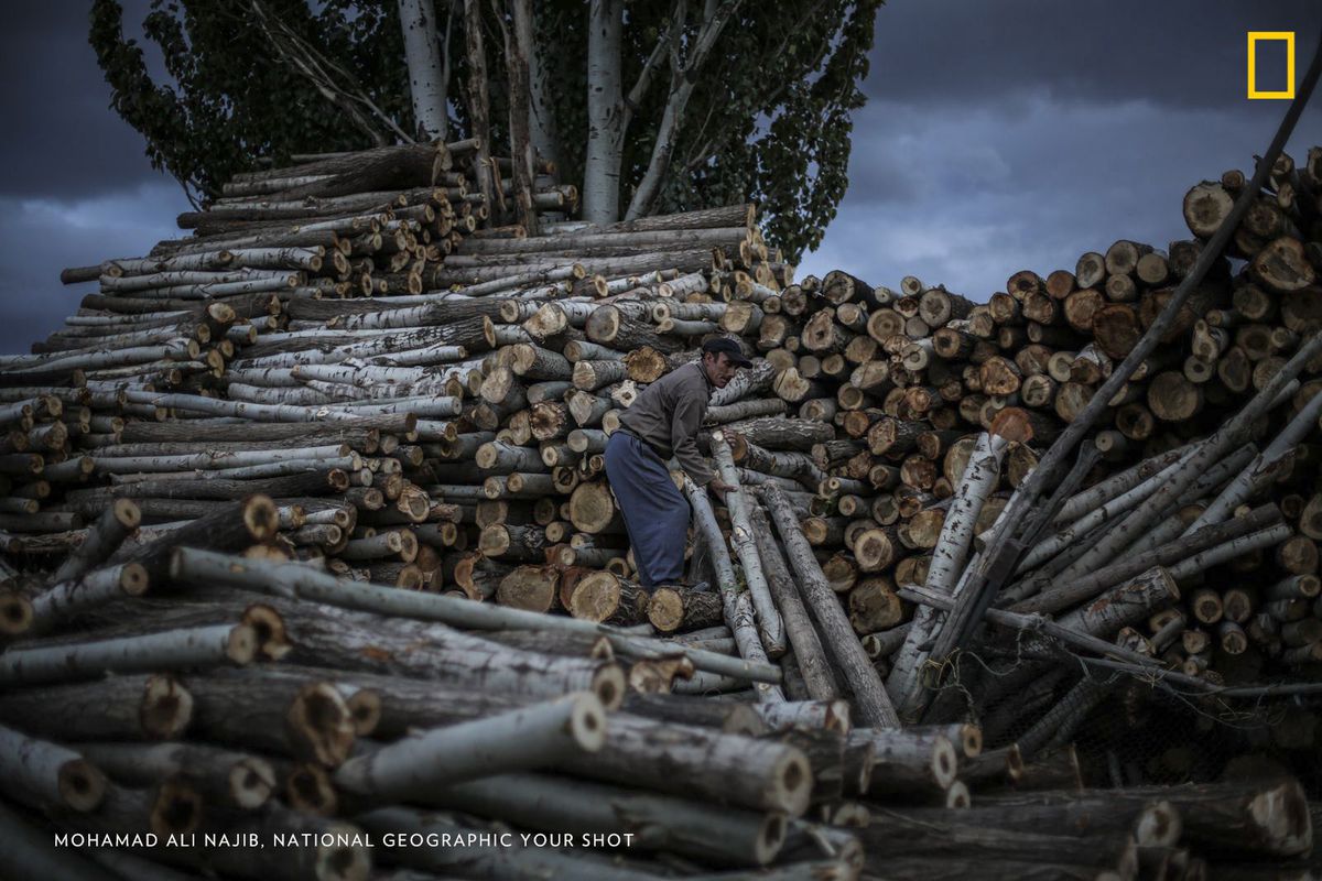 A man moves tree trunks in the Zagros Mountains near Hamedan, Iran. Deforestation affects 30 percent of the forest.