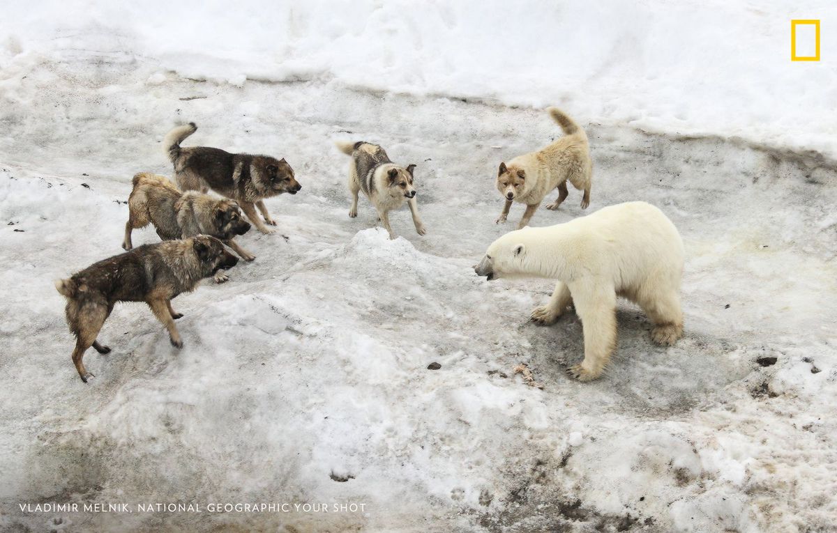 Guard dogs confront a polar bear on the Franz Josef Land archipelago. As Arctic sea ice disappears, bears are increasingly moving into human settlements in search of food.