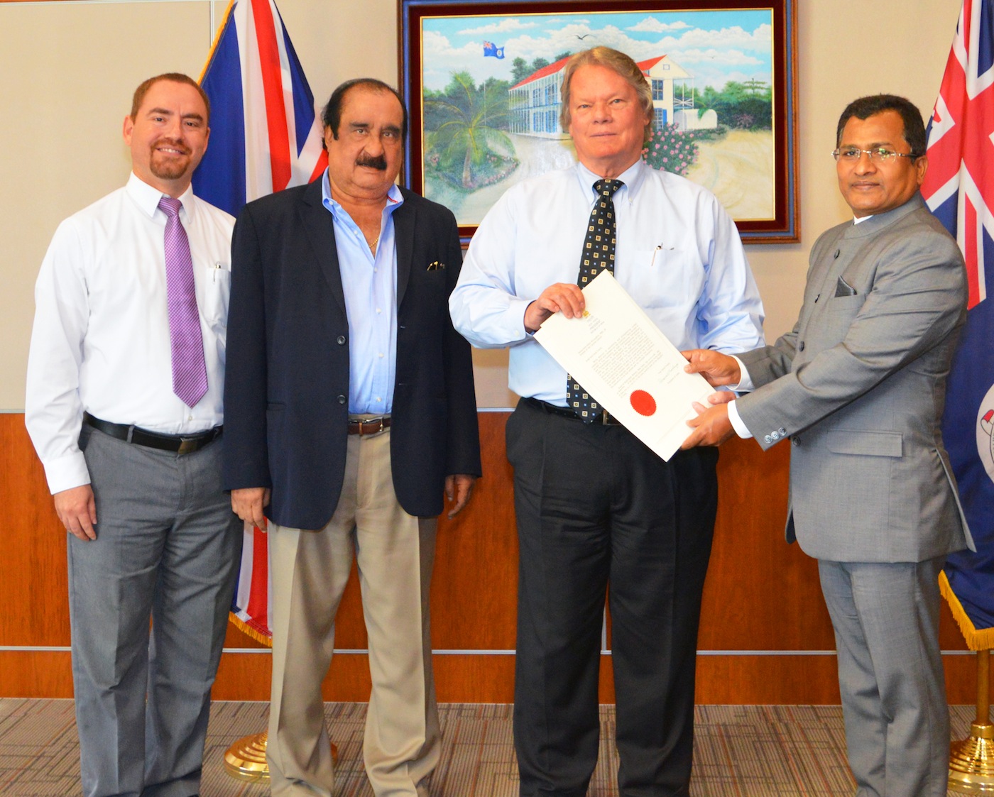 Acting Premier Hon. Moses Kirkconnell receives the credentials presented by His Excellency the Indian High Commissioner, Mr. Sevala Naik. Also present are from left: Chief Officer in the Ministry of District Administration, Tourism and Transport, Mr. Stran Bodden and unofficial Honorary Counsel for India, Dr. Krishna Mani.