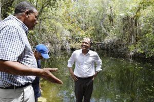 The visit to the inland feature involved walking across ironshore through a large and shady copse of ancient mahogany and ironwood. The Governor commented on the natural beauty of the site and the MLA explained what an invaluable resource the body of water continues to be to the island, and to the livelihood of East End residents in particular.