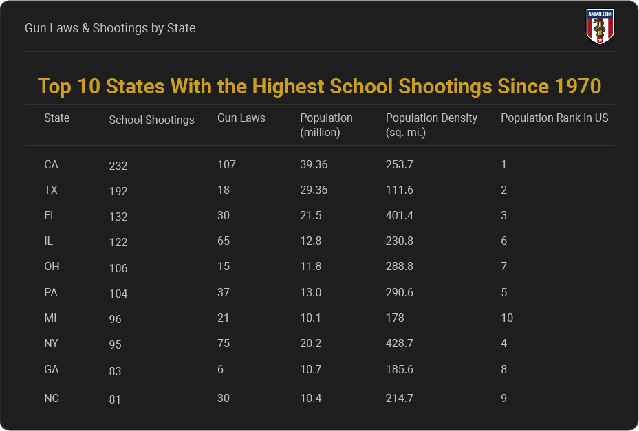 California has strict firearms laws but also has the highest number of school shooting-related incidents. On the contrary, Texas has a similar population size, relaxed firearms laws, and nearly as many school shooting incidents.