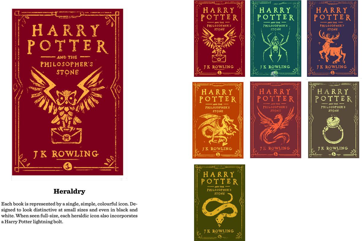 There’s an unpublished series of covers dubbed “Heraldry,” which picks up a different icon for each book — there’s giant spider Aragog on the Chamber of Secrets cover, a Hungarian Horntail for the Goblet of Fire and Marvolo Gaunt’s Ring from the Half-Blood Prince.