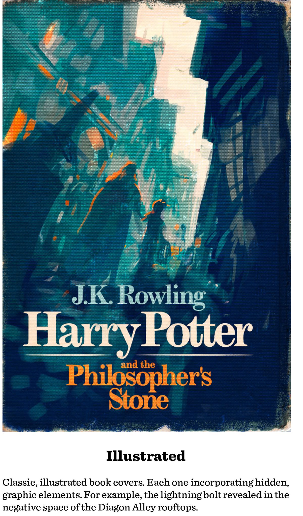 Among the alternative cover stash, you’ll also find the collection of “Travel” posters Moss ran with Pottermore in 2016.