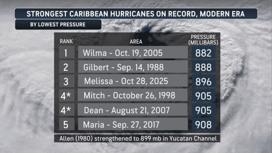 - Hurricane Melissa was the third-most intense Caribbean hurricane ever on record, with a minimum central pressure recorded at 892 millibars (26.34 inches).