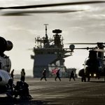Ahead of the departure, two twin-engine Chinook transporter helicopters landed on board, and will take part in the trials.